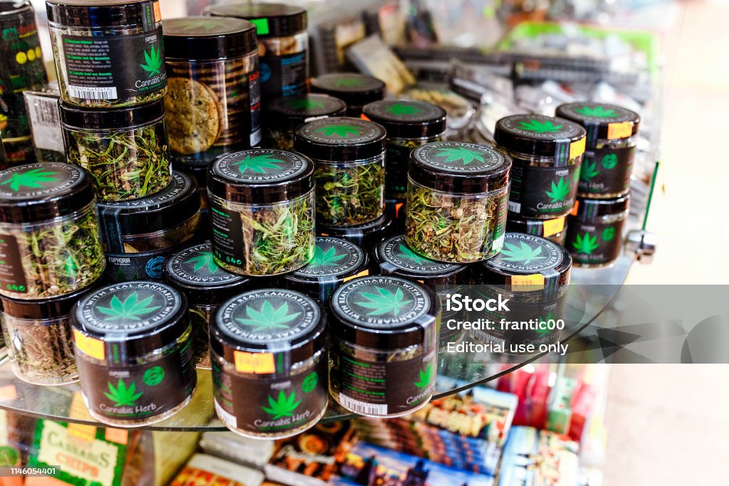 07 December 2017, Prague, Czech Republic: Sale of cannabis and other herbs in jars as a souvenir in the store