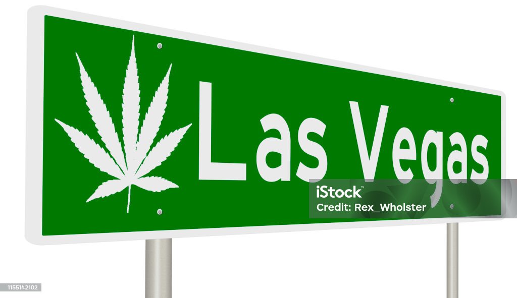 A rendering of a green road sign with marijuana leaf for Las Vegas