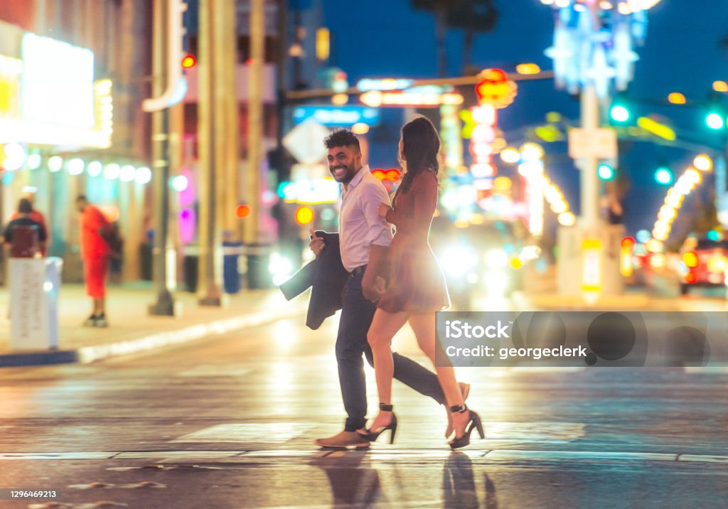 A young couple enjoying the Las Vegas nightlife together, crossing a bright street surrounded by neon.