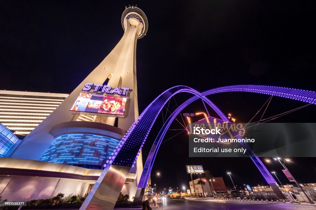 Las Vegas, NV, USA January 16th 2024 Strat Hotel Casino and Las Vegas sign at night. Stratosphere tower in Las Vegas. Stratosphere Tower, 1,149 ft (350.2 m) high, is the tallest freestanding observation tower in the USA.