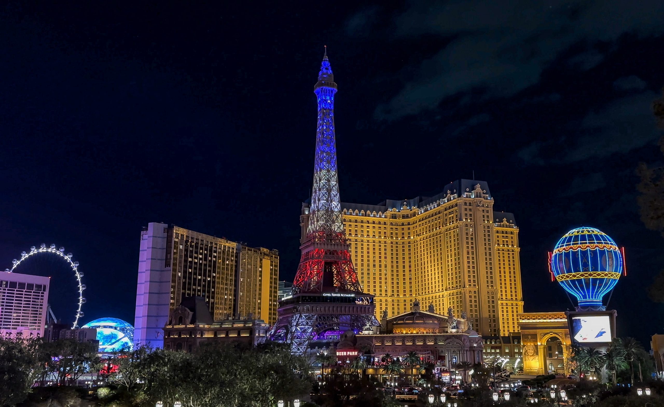 The beautiful Center Strip classic view at night. Neon lights illuminate Paris, the Eiffel Tower, The High Roller and the Sphere – Las Vegas, Nevada, USA